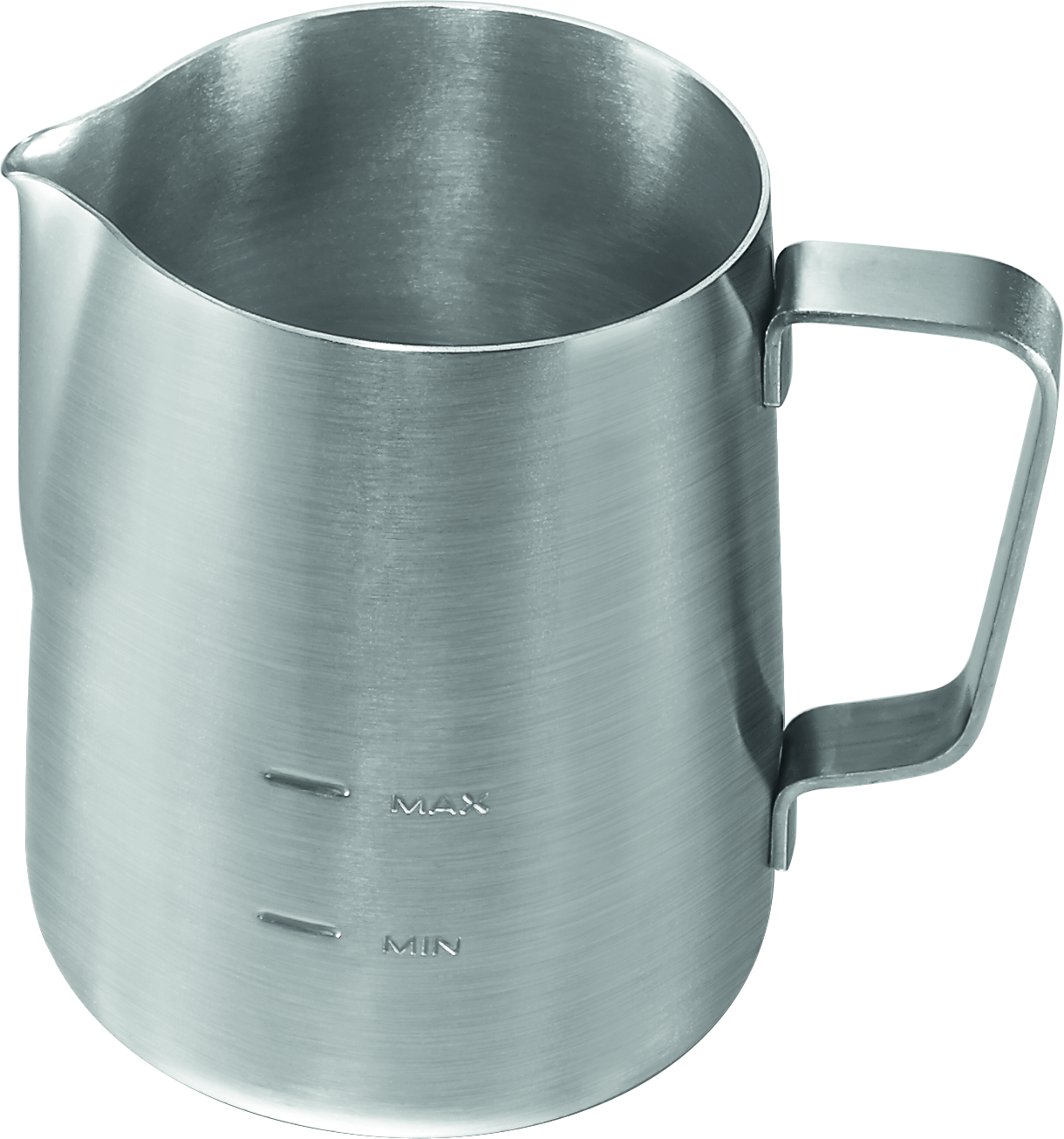 Baristatyylinen ruostumattomasta teräksestä valmistettu maitokannu (460 ml), jossa minimi- (150 ml) ja maksimitasot (250 ml) on merkitty sekä sisä- että ulkopuolelle.